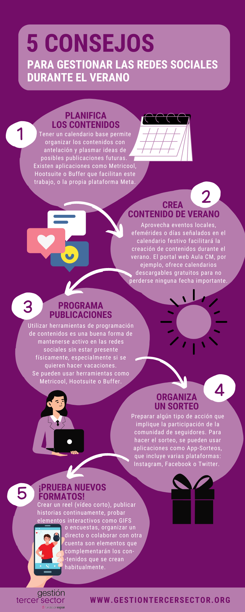 Llega el verano, las vacaciones y la desconexión. Si gestionas las redes sociales de tu entidad en esta época, desde Gestión Tercer Sector te ofrecemos cinco consejos para que te sea más fácil hacerlo. Desde la planificación y programación de contenidos hasta el uso de contenido visualmente atractivo, descubre cómo conectar con tu público en este período.