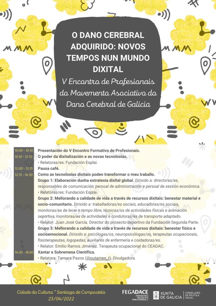 Como agente activo en el tercer sector gallego, Gestión Tercer Sector está participando este fin de semana en el evento organizado por la Federación Gallega del Daño Cerebral que tiene lugar el 23 de abril en la ciudad jacobea de Santiago de Compostela. La Federación Gallega del Daño Cerebral (FeGaDaCe) es una entidad de segundo nivel de la que hacen parte distintas organizaciones que trabajan para mejorar la calidad de vida de las personas que conviven con Daño Cerebral Adquirido y sus familiares.