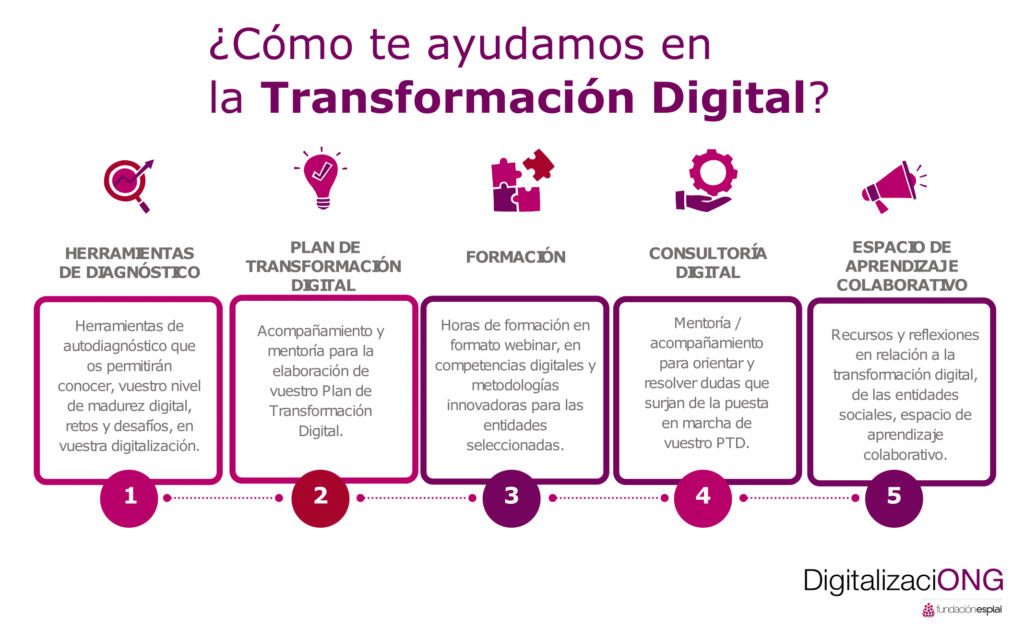 Este programa, busca el descubriendo las mejores prácticas para la transformación digital de vuestras entidades, mediante el desarrollo de un diagnóstico de Madurez Digital, la implantación de un Plan de Transformación Digital y el acompañamiento mediante asesorías y consultorías. Descarga la infografía. |