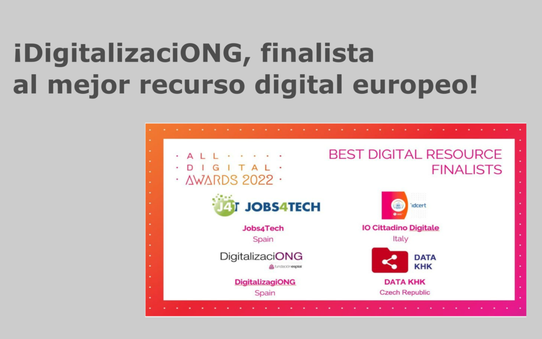El programa DigitalizaciONG ha sido seleccionado como finalista en los ALL DIGITAL AWARDS 2022, como mejor recurso digital europeo. Estos premios de alcance europeo, son otorgado por la entidad All Digital, consultora de la Comisión Europea en materia de competencia y transformación digital.